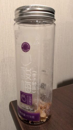 梧州の駄菓子屋で買った梅の干し菓子に似たようなのを買う度に混ぜてたら、とうとう日本までもってしまいました。移動中のひと齧りとか、結構重宝しました。
