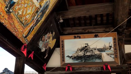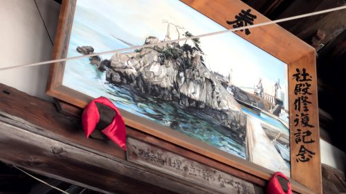 分かった。下に消えかかった文字で「絵馬は埋め立て前のなべ小島」と記されてました。