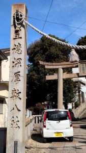 下山。正面入口に案内板。御祭神は品陀和氣命(應神天皇)、息長帯比賣命(神功皇后)、玉依昆賣命(神武天皇の御母)