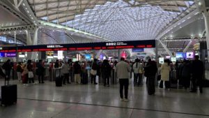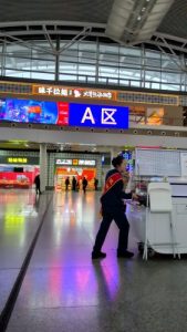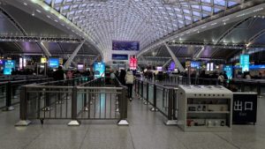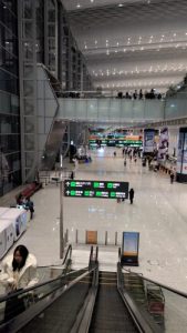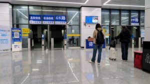 物凄い広い出站口ばかりのフロアの両端に、进站乘车と書いてあるエスカレーターがある。ここからのみ三階の待合に上がれるらしい。