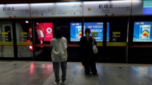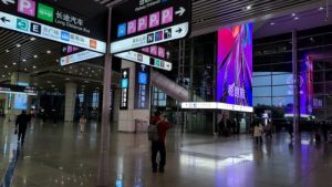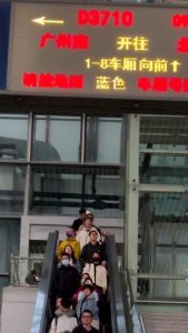 広州のホームは車両番号表示が四種類の色。電光表示をよくよく見ると「藍色」と書いてある。
