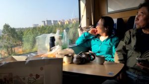 対面に乗ってきた夫婦が茶器をセットしてミカンを肴に飲茶し始めました。そんなんありか?撮影したいけどちょっと叱られそう。──てゆーか、そのテーブル、ワシも1/4は区分所有してるんだけど……