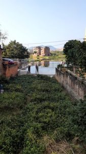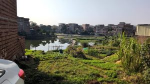 いきなり古式の養魚場。脇に畑。向こうに家並み。